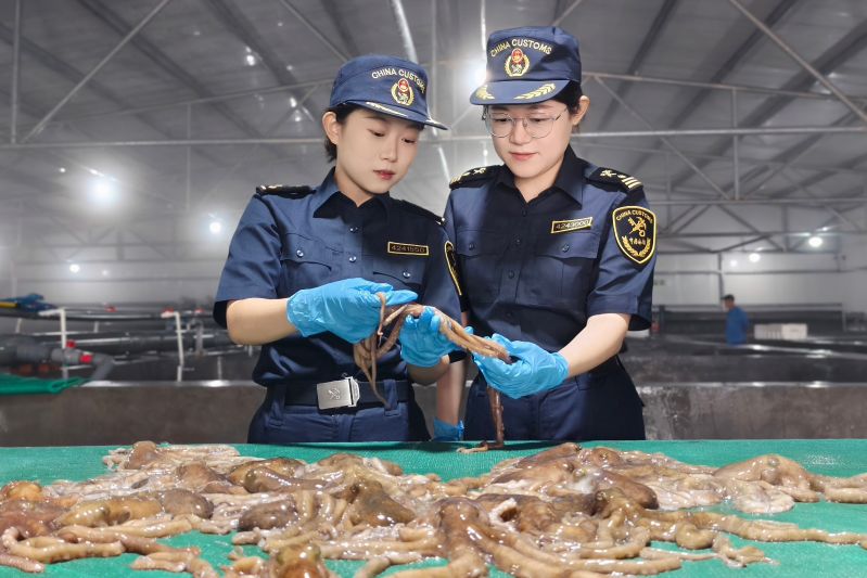 10月10日上午9點,青島海關(guān)所屬煙臺海關(guān)關(guān)員王國利和同事準時出現(xiàn)在車間。他們干凈利落地檢測水溫、水體鹽度,并嚴格檢查活章魚的體表狀態(tài)和活力等,確保其狀態(tài)良好、無檢疫風(fēng)險。