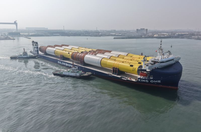 近日,在海關(guān)監(jiān)管保障下,4萬(wàn)噸甲板運(yùn)輸船KING ONE輪在大金蓬萊海工基地首航,裝載8根大型風(fēng)電單樁駛往歐洲。