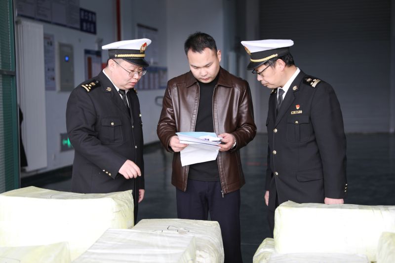 圖為:海關(guān)關(guān)員正在與企業(yè)核對(duì)人發(fā)原材料信息 顧曉晴/攝