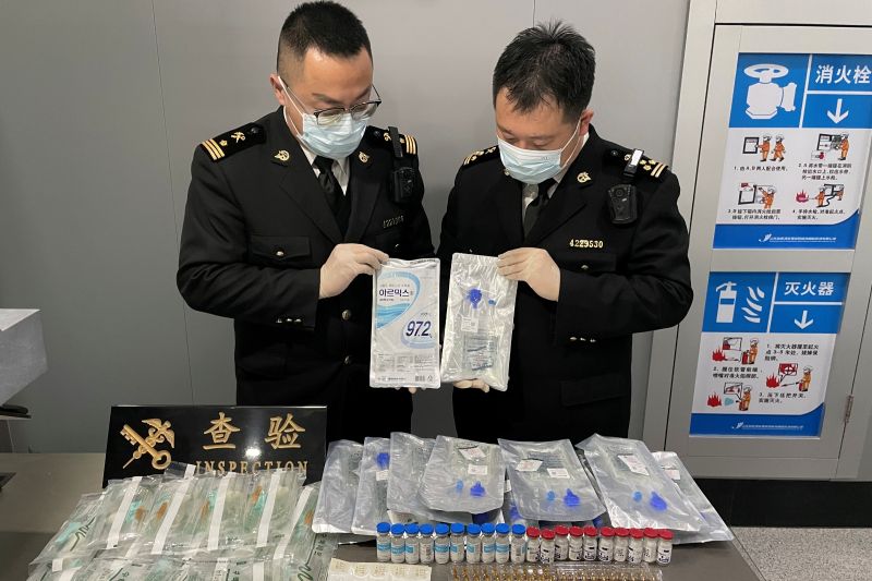 圖為:海關(guān)關(guān)員查獲針劑等醫(yī)療用品 王天賜/攝